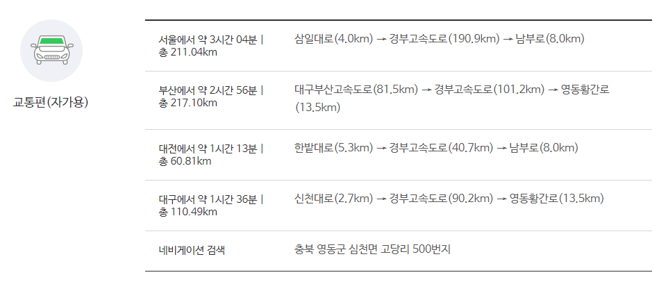 - 자가용: 서울에서 영동까지 약 2시간 30분, 김천까지는 약 3시간 소요