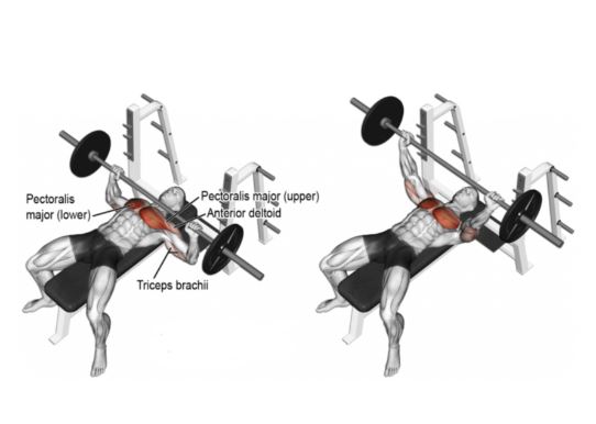 인클라인 벤치 프레스를 하려면 벤치를 15~30도 각도로 들어 올립니다. 이 운동은 가슴 윗부분을 단련하여 균형 잡히고 균형 잡힌 가슴을 만드는 데 도움이 됩니다. 템포를 조절하여 8~12회씩 3세트를 반복합니다.