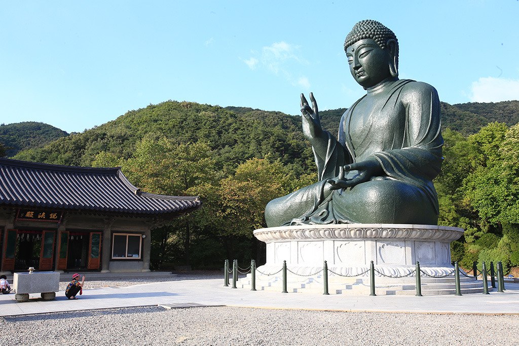 ‘태조산각원사’는 절집의 규모도 크지만 국내최고 크기의 불상이 유명하다. 각원사는 몰라도 천안의 ‘남북통일기원 청동대불’이라 하면 알 정도다. 남북통일의 염원을 담아 사찰을 세우려 한 것이 발원의 본뜻, 각원사의 이 불상을 직접 친견하면 놀라지 않을 수 없다. 좌대의 지름이 10m, 좌대와 불상 전체높이가 15m로 실제 불상 앞에 서면 불상의 크기를 나타내는 수치는 기억 속에서 사라진다. 크기에 압도당하고 숭엄한 불상의 모습에서 절로 고개 숙이지 않을 수 없다.