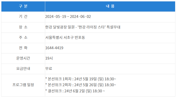 결선은 6월에 한강 야외무대에서 개최됩니다. 결선에서는 각 분야의 최종 우승자가 결정되며, 화려한 무대와 함께 다양한 공연이 펼쳐집니다. 결선 무대는 많은 관객들이 모여 참가자들을 응원하며, 한강의 아름다운 경치를 배경으로 한 멋진 공연이 펼쳐집니다.
