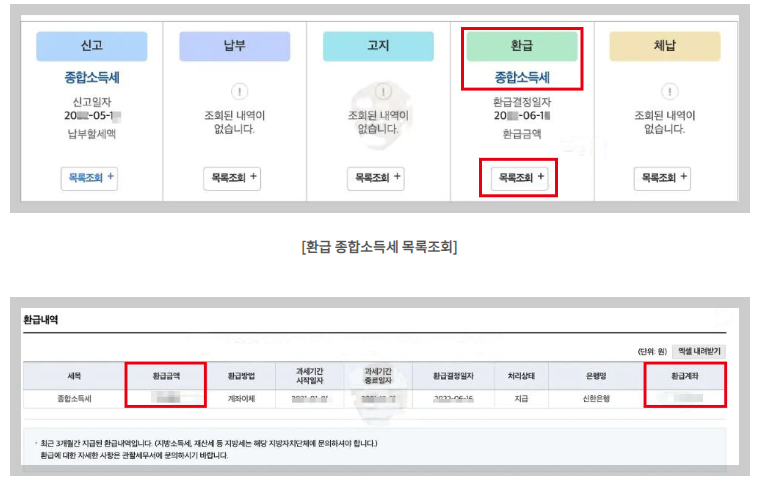 국세청 홈택스 로그인 > my홈택스 > 환급 종합소득세 목록조회