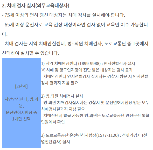 75세 이상 면허 갱신 대상자는 치매 검사를 받아야 합니다. 이 검사는 지역 치매안심센터, 병·의원, 도로교통공단 운전면허시험장 중 한 곳에서 실시할 수 있습니다.