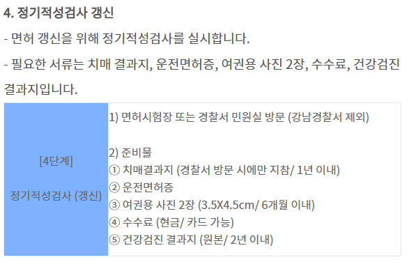 교육을 이수한 후에는 정기적성검사를 갱신해야 면허를 갱신할 수 있습니다. 이 과정을 통해 운전자의 건강 상태와 운전 능력을 확인하고, 안전한 운전을 위한 준비를 마칠 수 있습니다.